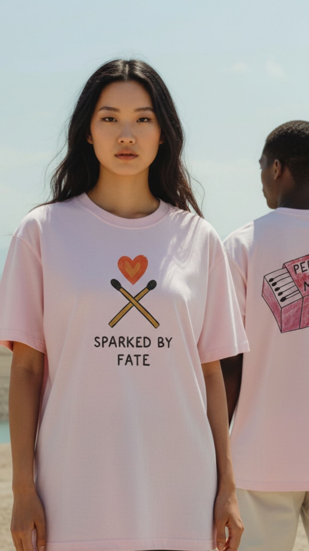ID perfect match T-Shirt, feel the spark . Una camiseta para aquellos que buscan conexión y buena vibra. Un imprescindible para quienes confían en el destino, porque algunos matches están destinados a serlo. Un diseño dedicado los hopeless romantic, esta es tu señal para encontrar esa llama que prende pero no se apaga.   Dawn pink, oversize real, caída amplia. 100% algodón orgánico peinado (240 g). Diseñada con propósito y fabricada en España. Edición limitada. Custom piece. Cuando se acaban, se acaban.   Product details: